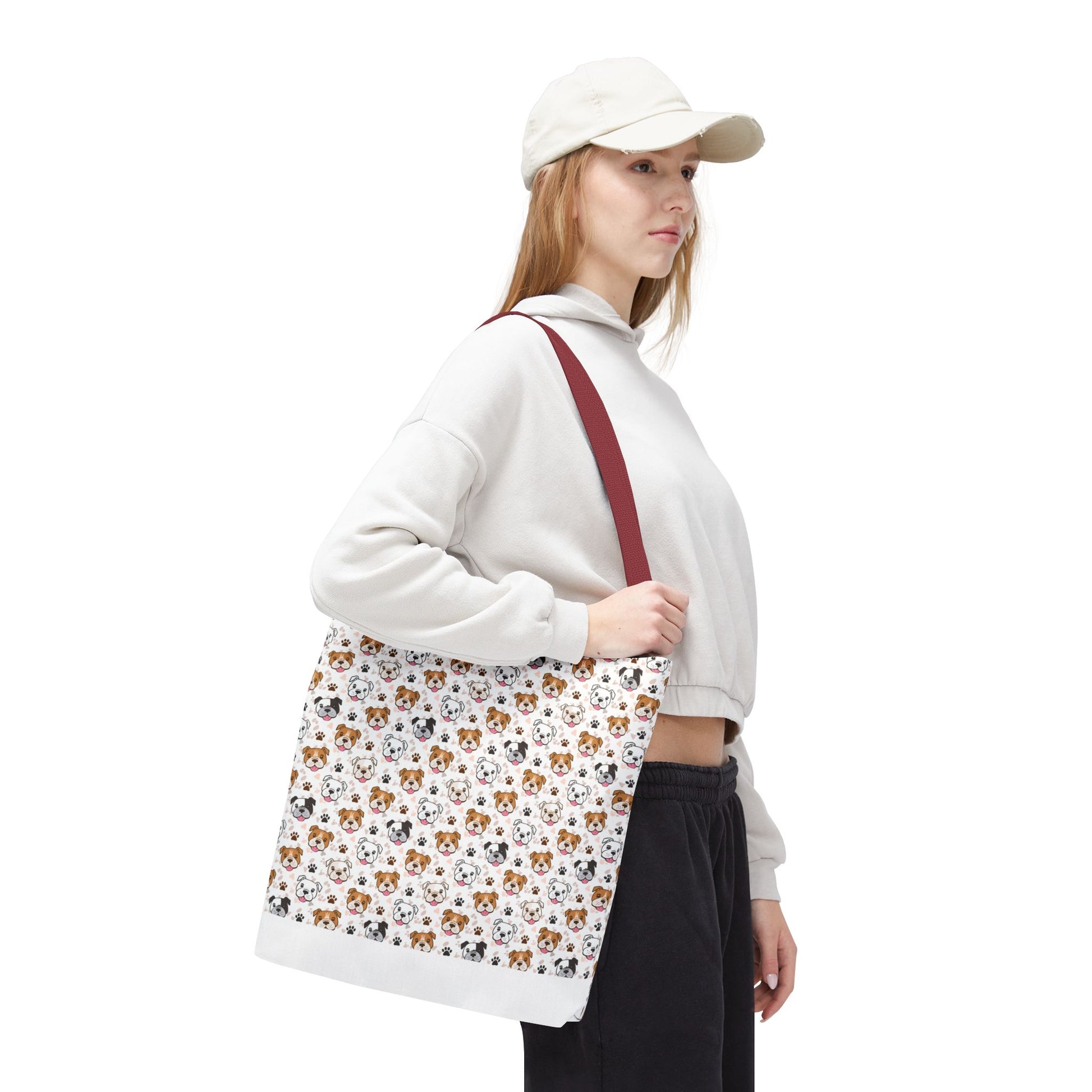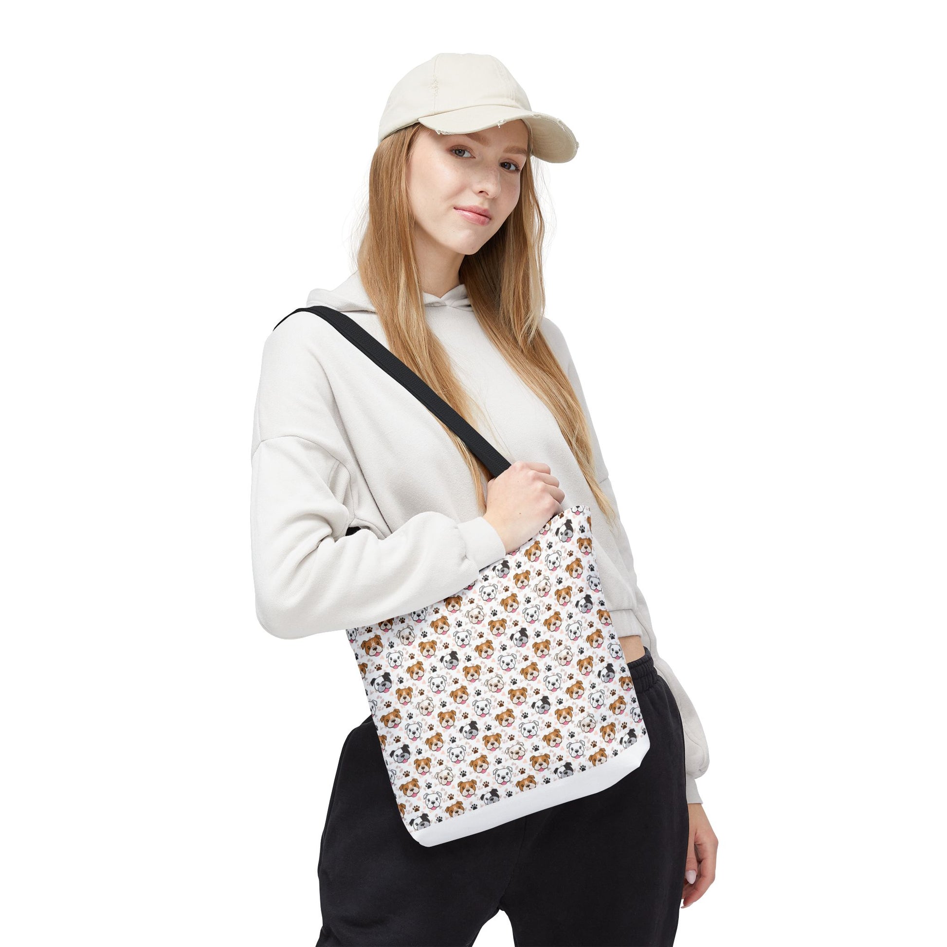 This Tote Bag features an adorable design of an English Bulldog face and paw print, perfect for dog lovers and animal enthusiasts. The durable polyester fabric and reinforced stitching make it ideal for everyday use, whether for carrying groceries, books, or essentials. This Tote Bag can add a touch of cuteness to any outfit and is a great accessory for casual outings or trips to the beach.